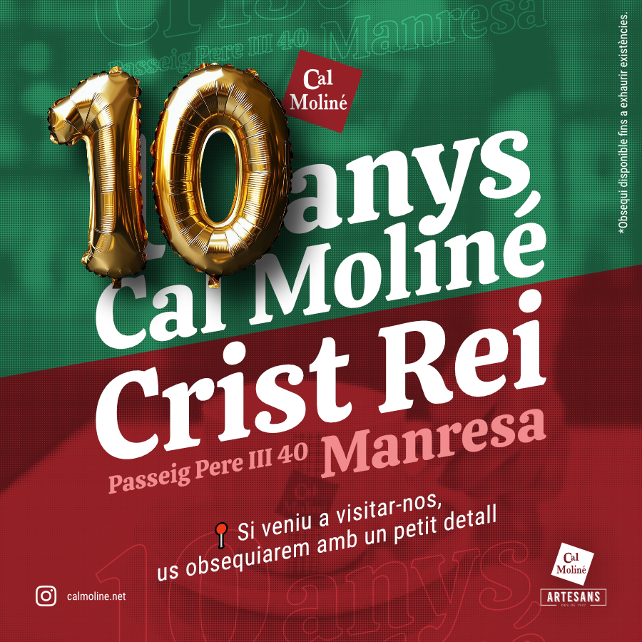 El dia 3 d’octubre, Cal Moline de Crist Rei (Manresa) celebra una dècada plena de dedicació, passió i complicitat amb tots vosaltres. Per això, us volem fer partícips d’aquesta alegria!
