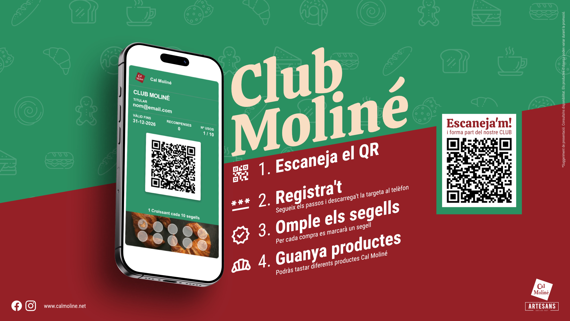 El Club Moliné és el nostre programa de fidelització dissenyat per premiar la teva confiança. La idea és molt senzilla: volem que cada vegada que triïs el nostre pa artesà o la nostra brioixeria, estiguis un pas més a prop d’un obsequi de la casa. No es tracta només de comprar, sinó d’anar sumant segells per gaudir de la recompensa final que preparem per a tu.